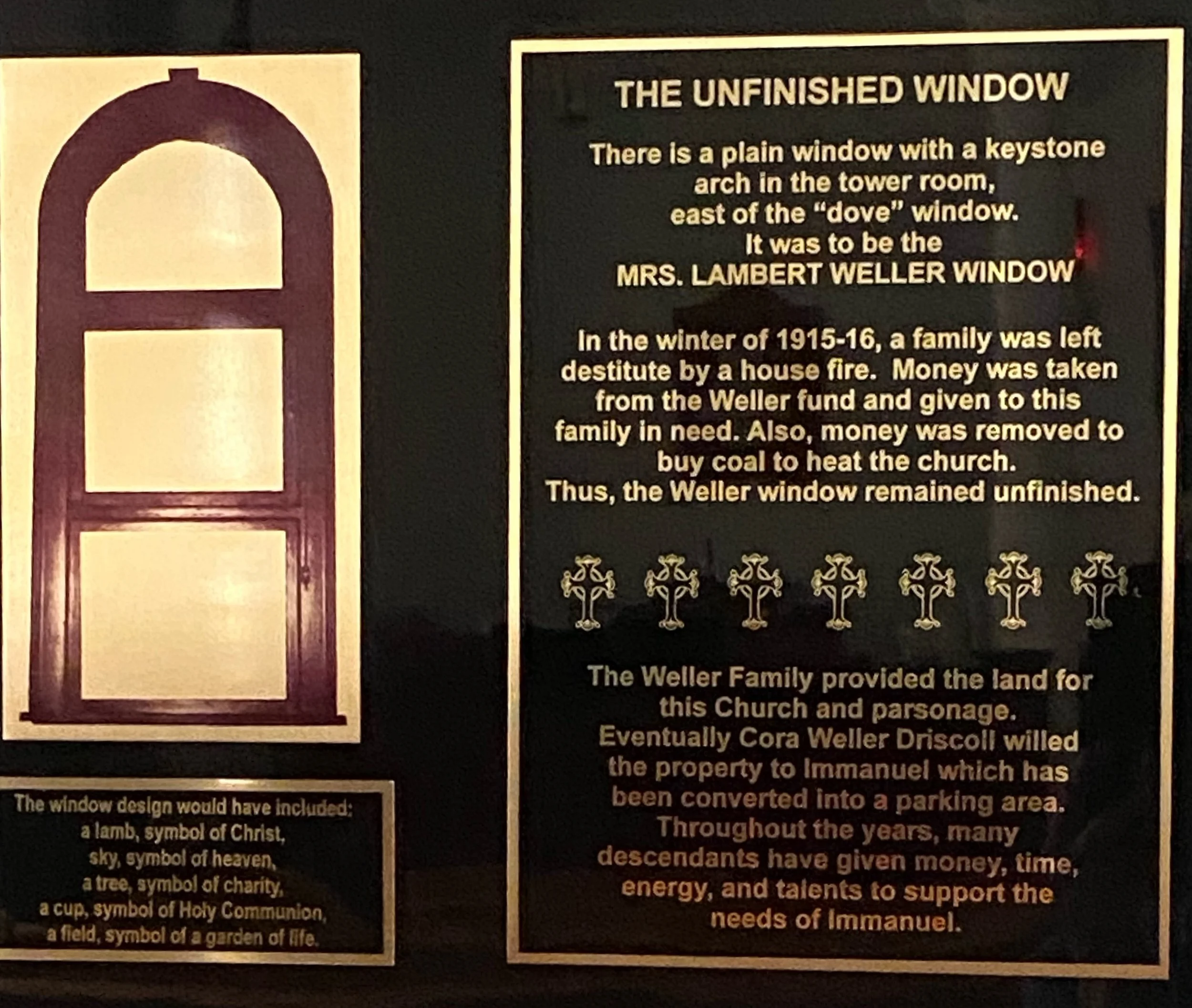 In the winter of 1915-16, a family was left destitute by a house fire. Money was taken from the Weller fund and given to this family in need. Also, money was removed to buy coal to heat the church. Thus, the Weller window remained unfinished.